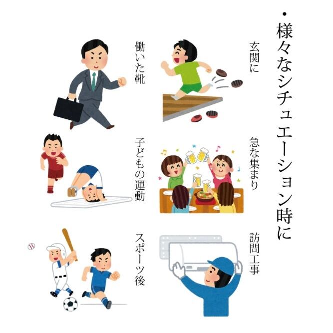 自宅の玄関はもちろん、営業先の訪問、急な集まり、訪問工事や子供の運動靴、スポーツ後などなど。